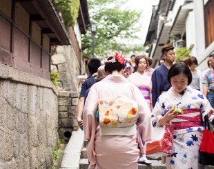 Crowded with many tourists , Kyoto attractions . Among them , as from the Yasaka Shrine to Kiyomizu Temple still has old-fashioned appearance . Rikisha is running , women walk sedately that wearing a kimono .